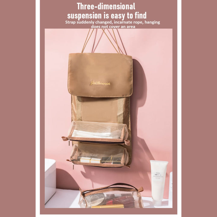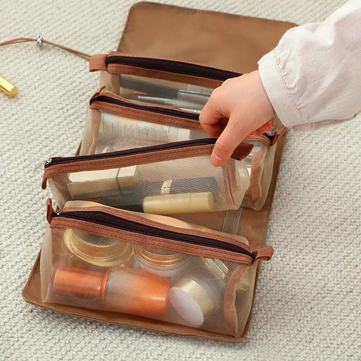 This innovative pouch is a game-changer for makeup enthusiasts and travelers alike. It seamlessly combines the functionality of a makeup and cosmetic organizer with the convenience of a foldable design.