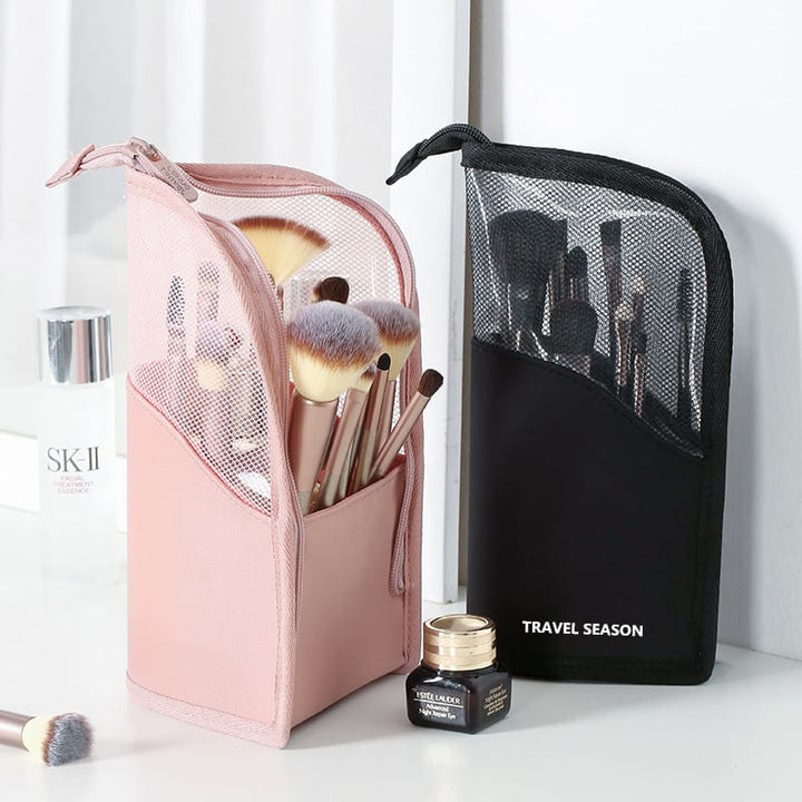 This innovative makeup bag combines the functionality of a brush holder with the convenience of a stand, making it an essential tool for any makeup enthusiast or professional artist.